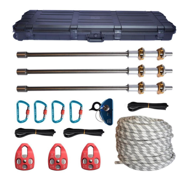 1.整套固定器包含便攜式金屬錨點 3 根,激流救援滑輪 3 個,D 型自動鎖 4 個,抓繩器 1 個,分(fēn)力闆 1 塊,靜力繩 1 根,輔繩 3 根,鐵錘 1 個,收納箱 1 個。